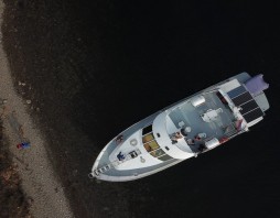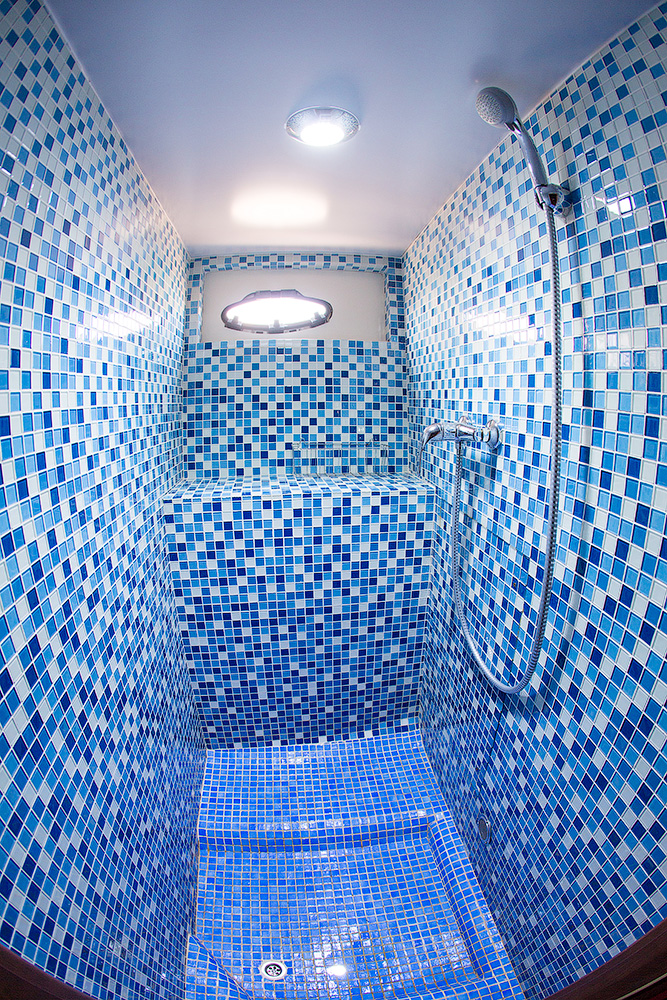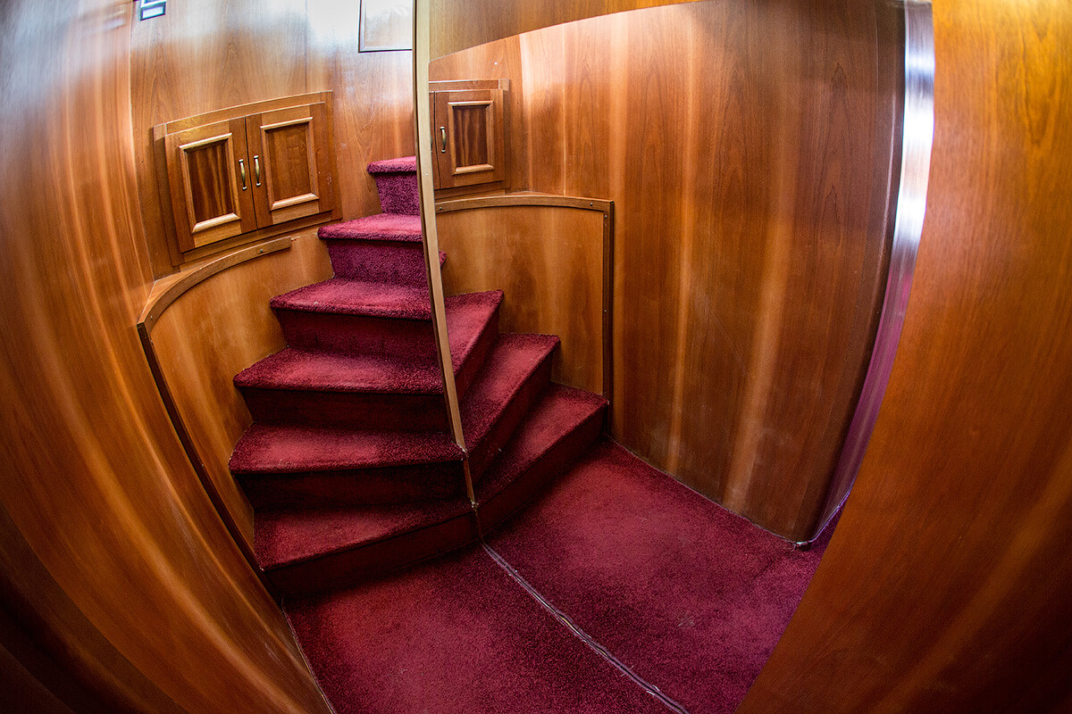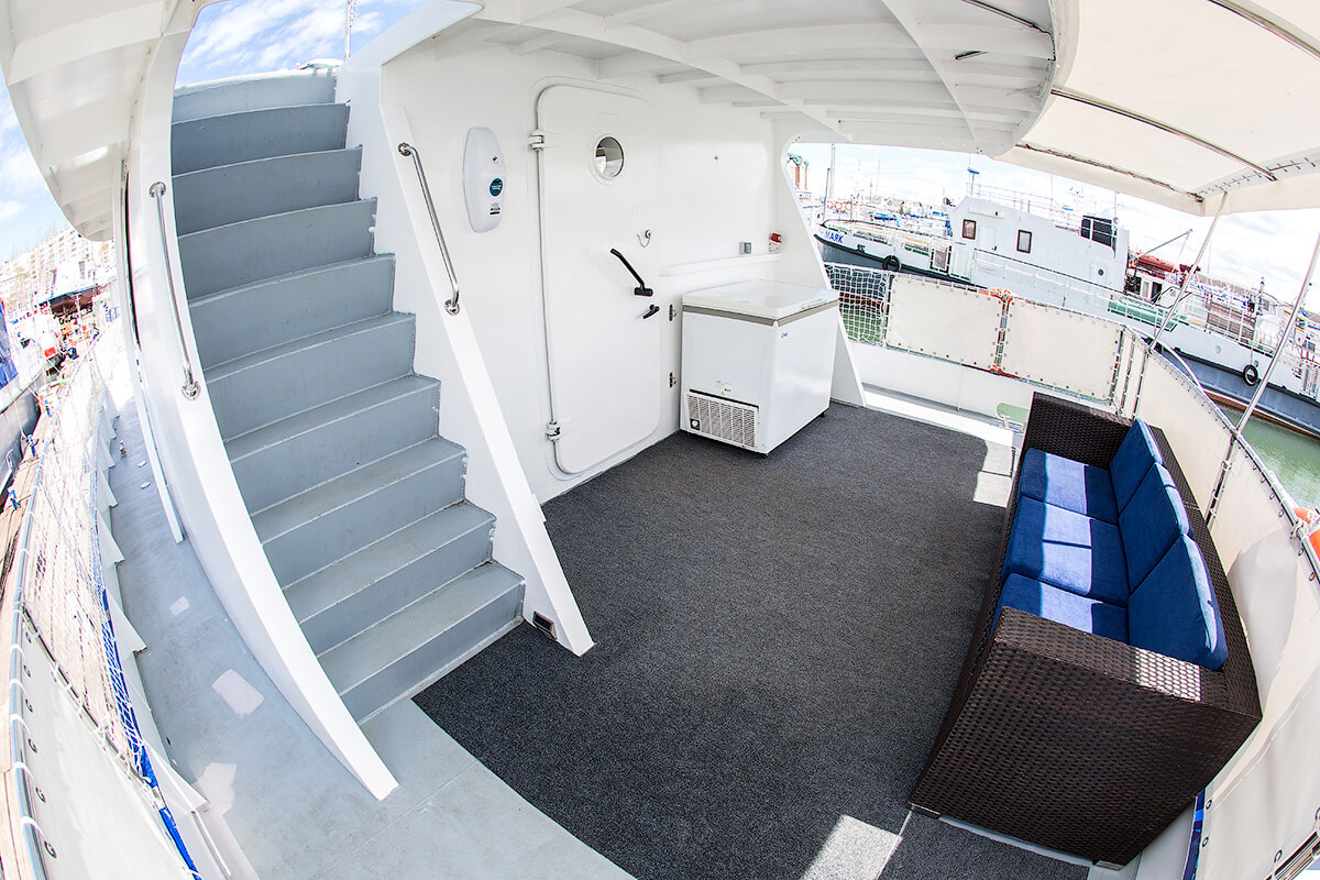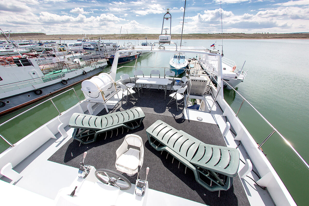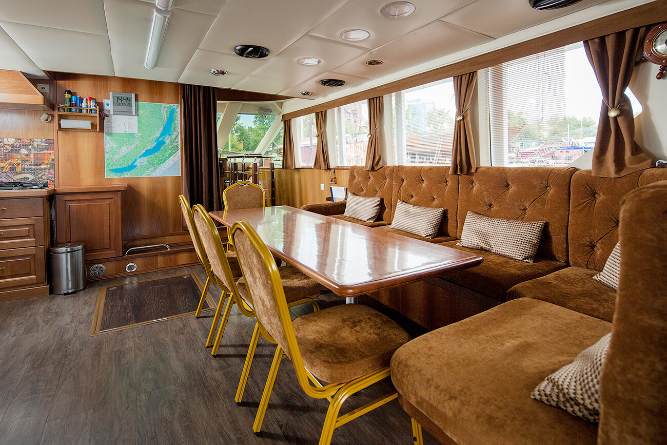 В отделке судна использовано дерево благородных пород, красное дерево Сапеле, Дуб. Большая кают компания со свободными проходами, за столом свободно размещаются 12 человек, большие панорамные окна, мягкий диван, кают-кампания оборудована всеми необходимыми развлекательными системами. Открытая вторая палуба - лучшее место на корабле в хорошую погоду, можно поставить лежаки для загорания, устроить обед или ужин на закате, так же оборудована музыкальными системами. В кормовой части оборудована большая площадка для купания и рыбалки, так же на площадке имеется душ с горячей и холодной водой.