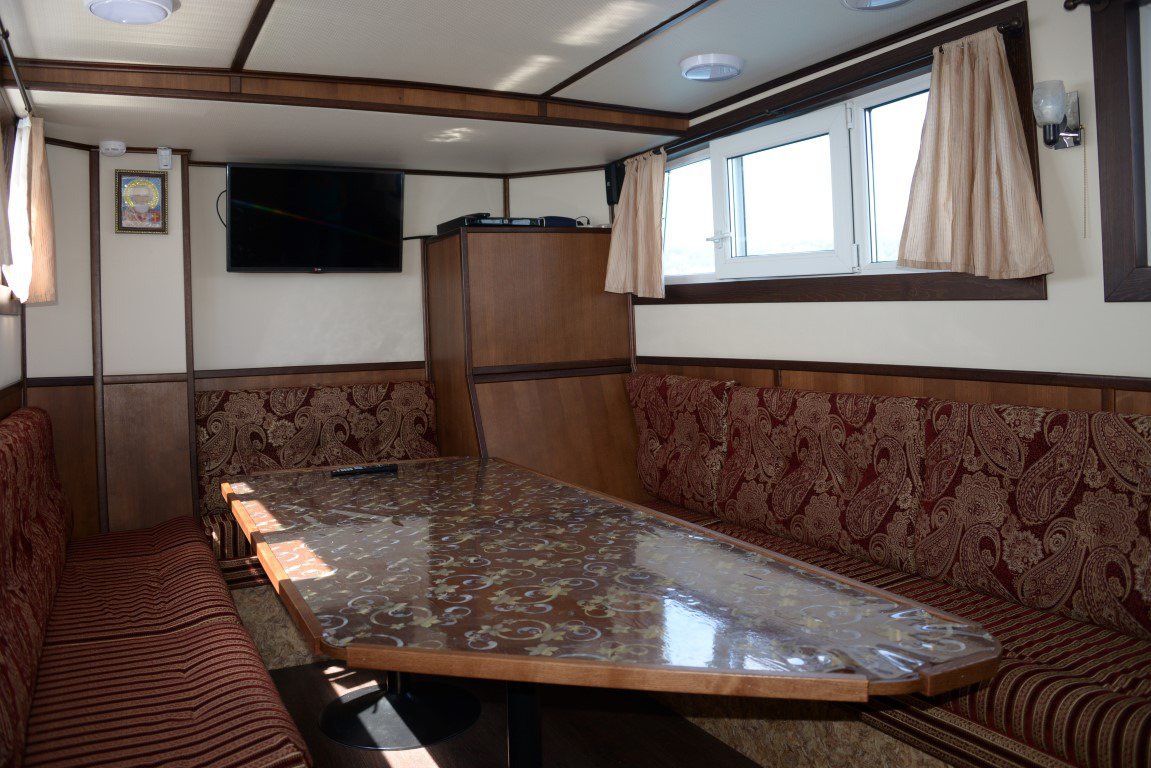 Рубка (служебное помещение). Кают-компания (место для приема пищи, посиделок, пения караоке, обмена впечатлениями): ТВ ЖК - панель, караоке, акустическая система 5:1. Камбуз (кухня) - отдельное помещение, максимально оборудованное бытовой техникой, посудой для приготовления и приема различных блюд. Сан. узел №3 (гальюн, раковина, душевая).